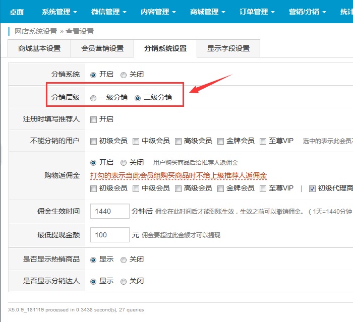 考慮到微信封殺三級(jí)分銷原因,商城系統(tǒng)設(shè)置里可以自由選擇設(shè)置是一級(jí)還是二級(jí)分銷。