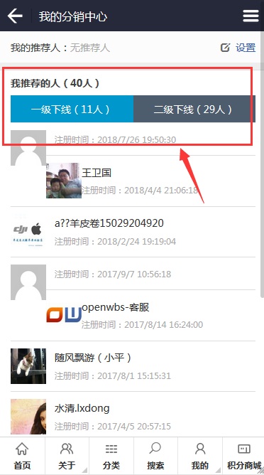 會(huì)員前臺(tái)手機(jī)端分銷下線列表和統(tǒng)計(jì):